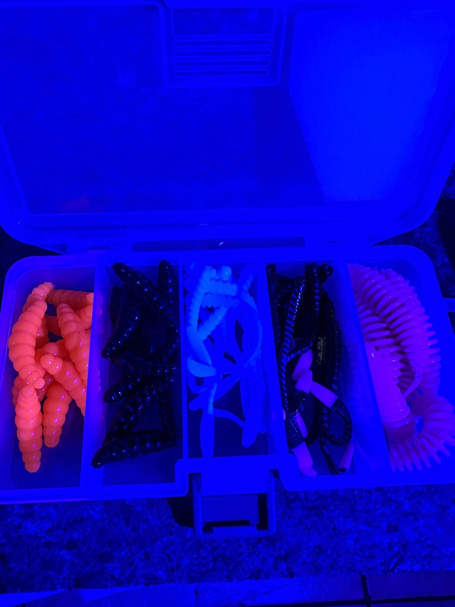 In der Forellenbox 2 befinden sich 50 Ickern UV Forellen Gummiköder gemischt aus Specki 35mm, Snake 65mm und Worm 65mm